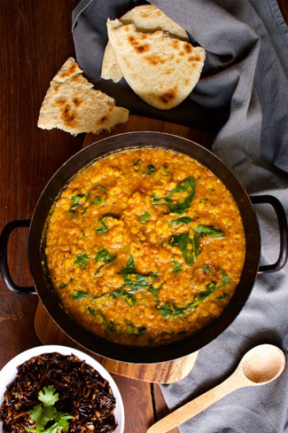 Zu Dhal wird meist eine Art von indischem Brot serviert, z. B. Naan oder Chapati. Und natürlich Basmati-Reis. Ich finde aber, dass auch Wildreis hervorragend dazu schmeckt!