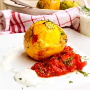 Von beidem hat Honey mir was mitgegeben. Das Mark verwende ich seither ziemlich oft. Ich liebe diese zitronig-herbe Note einfach! Besonders gern hab ich das aparte Aroma der getrockneten Limetten im Pilaw. Den hab’ ich diesmal aus Hirse und als Füllung für Zucchini gemacht. Zusammen mit der süßen Tomatensauce und der frischen Dill-Joghurtsauce ergibt das ein herrliches Gericht, das orientalische und mediterrane Aromen wunderbar verbindet! Köstlich!!